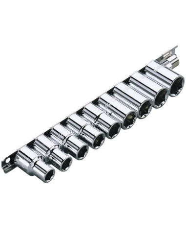- Rastrelliera per montare le bussole sul supporto, dotata di fori per montarla su un pannello portautensili o per appenderla su un muro tramite tasselli.